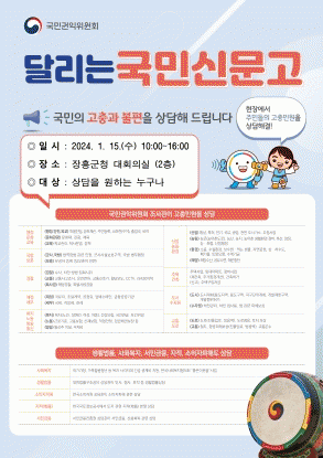 장흥군에서 열리는 이번 ‘달리는 국민신문고’에서는 국민권익위원회 조사관 및 협업기관 전문가 20여명이 참여하여 상담을 진행할 예정이다.