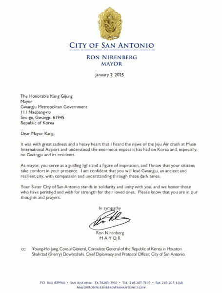 론 샌안토니오 시장은 서한문에서 “광주의 자매도시 샌안토니오는 이 어려운 시기를 함께 하나된 마음으로 지지를 보낸다”며 “피해자들의 명복을 빌고 유가족들에게 위로의 말씀을 전한다”고 했다.