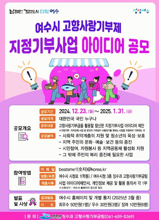 시 관계자는 “지정기부사업은 기부자가 원하는 사업을 선택해 기부하는 방식으로 추진된다”며 “여수시에 적합하고 기부자의 공감을 이끌어낼 참신한 아이디어를 기대한다”고 말했다.