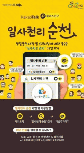 생활민원이 있는 시민들은 카카오톡에서 ‘일사천리 순천’을 검색해 친구 추가를 한 뒤, 간편하게 민원을 접수하고 1:1 대화를 통해 실시간으로 처리 상황을 확인할 수 있다.