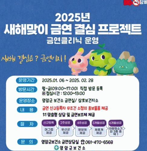 최문형 영암군보건소장은 “의지만으로 성공하기 어려운 금연을 돕기 위해 전문요원이 상담을 바탕으로 다양한 지원을 해주는 프로젝트에 많은 분들이 참여해주길 바란다. 새해에는 금연으로 더 건강한 생활을 이어나가도록 영암군보건소가 돕겠다”라고 말했다.