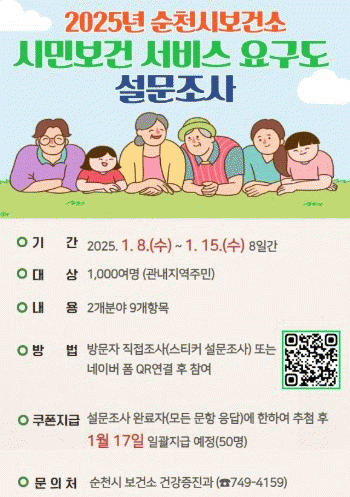 참여 방법은 순천시 누리집, SNS(페이스북, 블로그, 카카오채널, 인스타그램 등)를 통해 온라인으로 참여할 수 있으며, 시청, 보건소, 신대 및 연향 건강생활지원센터 민원실에 방문하면 스티커 직접조사를 통해서도 참여가 가능하다.