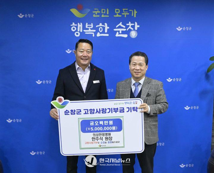 한주석 의성한방병원장이 최근 어려운 이웃을 돕기 위해 시가 2천만원 상당의 재래김과 500만원의 고향사랑기부금을 순창군에 전달했다.