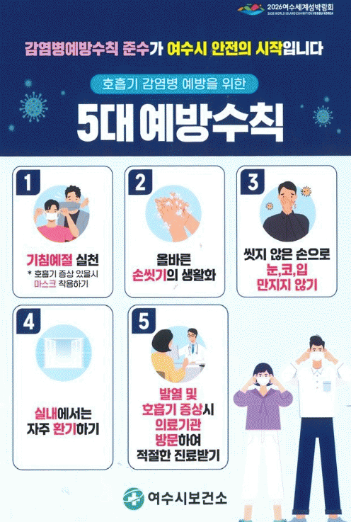 호흡기 감염병 예방을 위해 ▲30초 이상 비누로 손 씻기 ▲마스크 착용 ▲기침 예절 지키기 ▲2시간마다 실내 환기 등을 준수해야 하며, 사람이 많이 모인 행사에 참여하거나 불필요한 만남은 자제하도록 권고하고 있다.