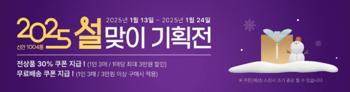 이번 기획전에서는 신안군의 대표 농수특산물을 설 명절 특별 할인 가격으로 판매한다. 30% 할인 쿠폰을 회원 1인당 3매씩 사용할 수 있으며, 최대 3만 원까지 할인 가능하며, 설 명절 선물 준비로 바쁜 고객을 위해 3만 원 이상 구매 시 무료배송 쿠폰도 지급한다.