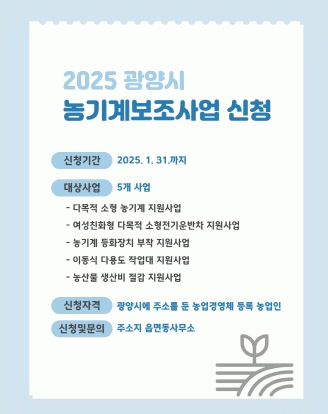 신청 자격은 광양시에 주소를 둔 농업경영체 등록 농업인이며 주민등록 주소지 읍면동사무소에서 농기계 보조사업을 신청하면 된다.