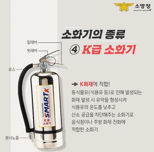 K급 소화기는 주방 화재, 특히 식용유나 유지 화재를 진압하는 데 특화된 소화기로, 고온의 식용유에 물을 사용할 때 발생할 수 있는 위험한 재발화를 방지하며, 기름 표면을 덮어 산소 공급을 차단하는 특수 소화약제를 사용합니다.