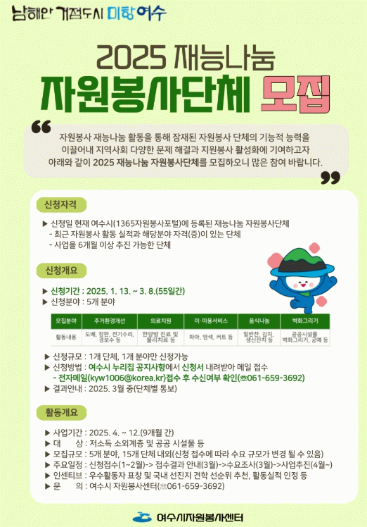 한편, 여수시는 지난해 14개 봉사단체를 선발해 집수리 사업, 독거노인 밑반찬 지원, 이·미용 및 의료서비스 제공, 2026여수세계섬박람회 홍보 벽화 그리기 등을 추진했다.