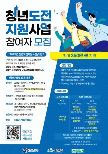 광산구는 청년 216명을 선착순 모집하며, 참여를 희망하는 청년은 고용24 또는 광산구 청년도전지원센터(062-716-2840)로 문의·신청하면 된다.