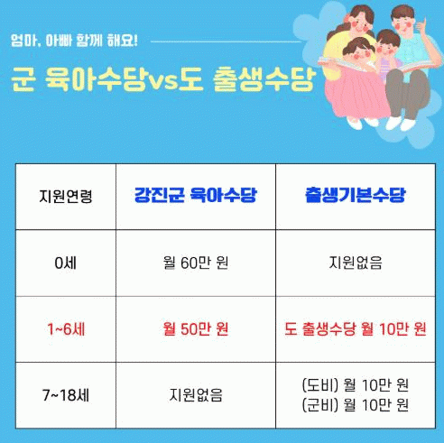 강진군은 기존의 육아수당과 연계하여 만0세는 강진군 육아수당 기존 60만원 지급, 만1세부터 6세는 도 출생수당 10만원(현금)과 강진군 육아수당 50만원 지급, 만7세부터 18세는 도 출생수당 10만원(현금)과 강진군 출생수당 10만원(모바일지역상품권)을 지급한다.