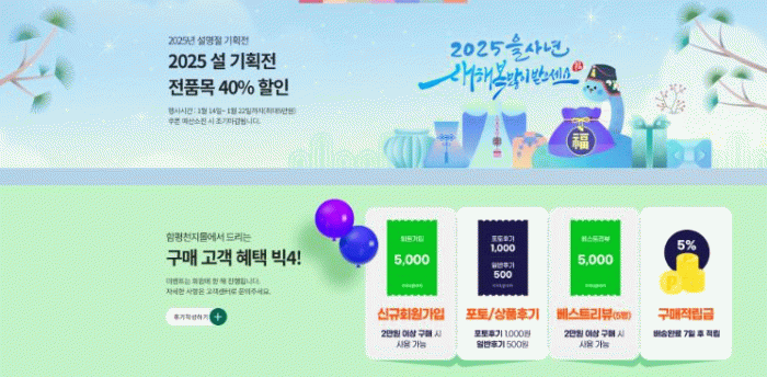 신규 가입 고객에는 5,000원 쿠폰이 제공되는 등 다양한 상시 이벤트가 기획되어 있으며 모든 상품은 무료로 배송된다.
