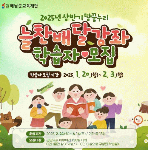 군 관계자는“늘찬배달강좌를 통하여 해남군민의 성장의 장, 배움의 장을 설계해 배움을 지역사회에 다시 나누는 선순환 평생학습 체계를 만들어 앞으로도 창의적이고 다양한 강좌로 질 높은 교육인프라를 제공하겠다”고 밝혔다.