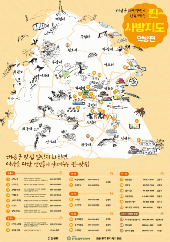 해남군 화원면 주민들이 직접 먹거리, 즐길거리, 포토존, 체험거리가 있는 곳을 발굴하고 손으로 그려 지도를 만들었다.