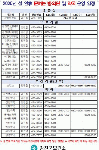 자세한 운영 일정은 강진군청 및 보건소 홈페이지, 다중이용시설 안내문, 아파트 홍보판 등에서 게시와 응급의료정보제공 앱, 보건복지콜센터, 구급상황관리센터, 주요 검색포털에서 '명절 진료' 검색 등을 통해 확인할 수 있다.