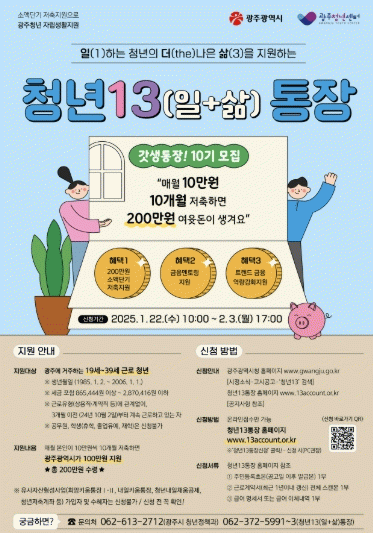 이 사업은 19~39세(1985년 1월2일~2006년 1월1일 출생) 근로 청년이 매월 10만원씩 10개월간 100만원을 저축하면, 광주시가 청년에게 100만원을 지원해 총 200만원의 만기금과 이자를 마련할 수 있는 광주시의 대표적인 청년 금융 자산 형성 지원 사업이다.