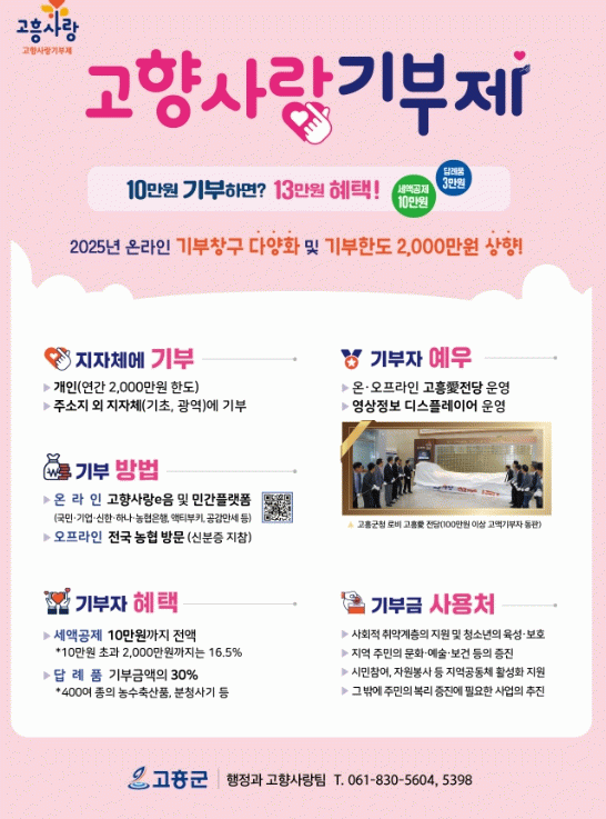 군 관계자는 “고향사랑기부제를 통해 고향에 대한 애정을 표현할 수 있는 기회를 놓치지 않기를 바란다”면서, “올해도 많은 분들이 고흥군 고향사랑기부제에 참여하여 세액공제와 답례품 혜택을 받으실 수 있도록 열심히 홍보하겠다”고 말했다.