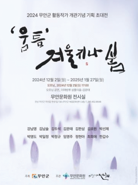 이번 '‘움틈’ 겨울지나 봄' 전시는 무안에서 활동하는 무안군 활동예술인 14인이 무안군 지역민들의 다양한 예술 작품 감상과 소통을 위하여 마련된 장으로, 2024년 완공된 신규 복합문화센터 원사 3층 무안문화원 전시실에서 행사가 진행된다.