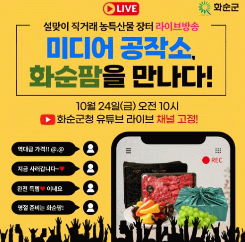 이번 라이브 방송은 직거래 장터에 참여하는 16개 업체의 판매 상품을 화순군청 유튜브 채널을 통해 실시간 방송으로 홍보하며, 화순팜 홈페이지를 통해 시청자들이 직접 상품을 구매할 수 있도록 진행될 예정이다.