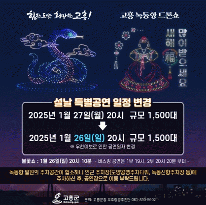 군 관계자는 “원활한 행사 진행과 안전한 공연을 위해 일정을 변경한 것이니, 관람객 여러분의 넓은 양해를 부탁드린다”며, “드론쇼 일정이 변경되면 녹동항 드론쇼 홈페이지나 고흥군 대표 누리집에 공지할 예정이니, 관람 전 미리 일정을 확인해 주시길 바란다”고 당부했다.