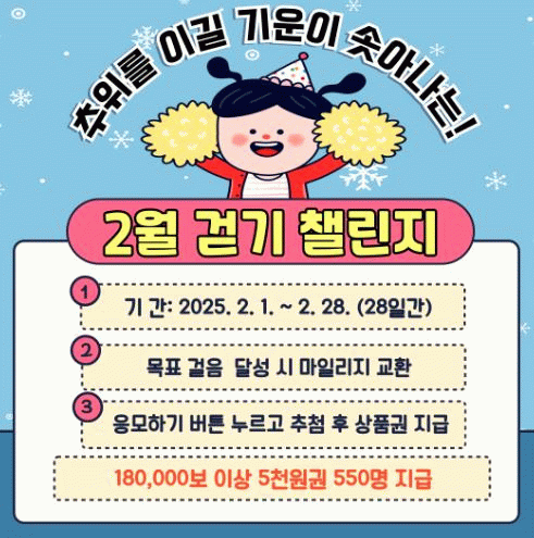 2월 1일부터 2월 28일까지 18만 보를 걷고 18만 마일리지가 쌓이면 모바일상품권 5천 원권 응모가 가능하다.