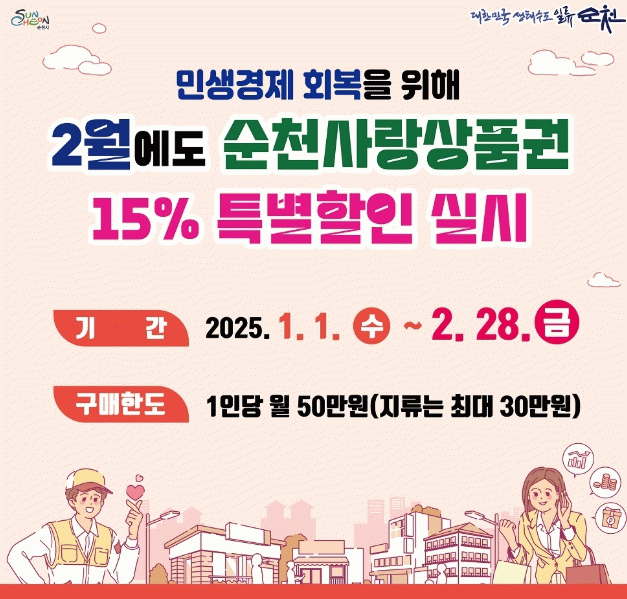 노관규 시장은 “순천사랑상품권 특별할인으로 골목상권 회복과 가계 경제에 도움이 될 것으로 기대한다”며, “지역 소비를 늘리고 가계 부담을 덜어드리기 위한 민생안정 대책을 펼쳐나가겠다”고 말했다.