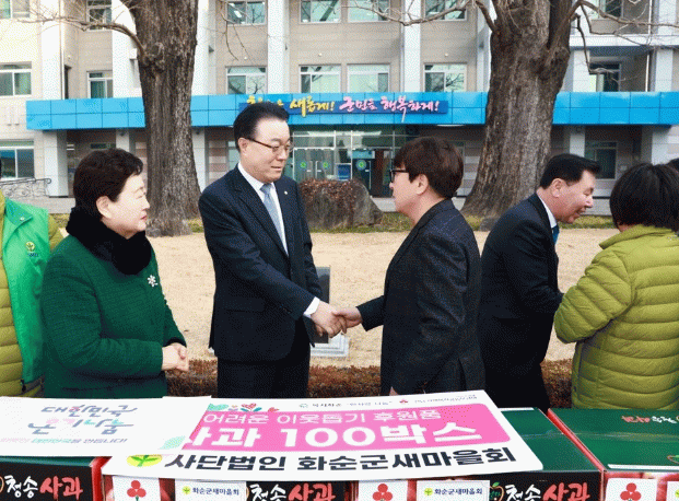 이날 화순군 새마을회와 새마을부녀회는 화순군청을 방문하여 관내 취약계층 주민과 복지시설 그리고 다문화 가정에 나눠달라며 600만 원 상당의 청송 사과 120박스와 200만 원 상당의 생필품을 화순군에 전달했다.