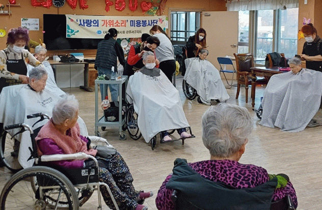 (사)대한미용사회 광주서구지회 회원과 구청 공무원 등 35여 명으로 구성된 ‘사랑의 가위소리’는 지난 21일 평강의 집 등 관내 노인요양시설 3곳을 방문해 어르신 70여 명을 대상으로 미용 봉사를 진행했다.