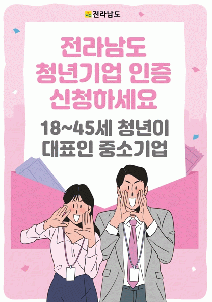 청년기업 인증은 전남에 소재하고 중소기업기본법 기준에 의한 중소기업이어야 하며 18~45세의 청년(2007~1979년생)이 대표인 기업 중에 국세 및 지방세 체납이 없고, 현재 정상적으로 운영 중인 기업이면 인증받을 수 있다.
