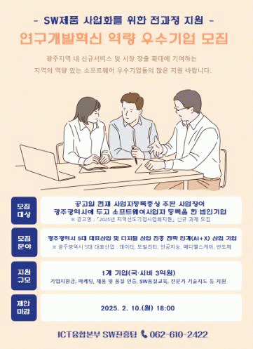 모집 대상은 공고일 기준 광주시 소재 SW사업자(주 사업장)로, 매출액 등 예비선도기업 세부요건를 충족한 기업이다.