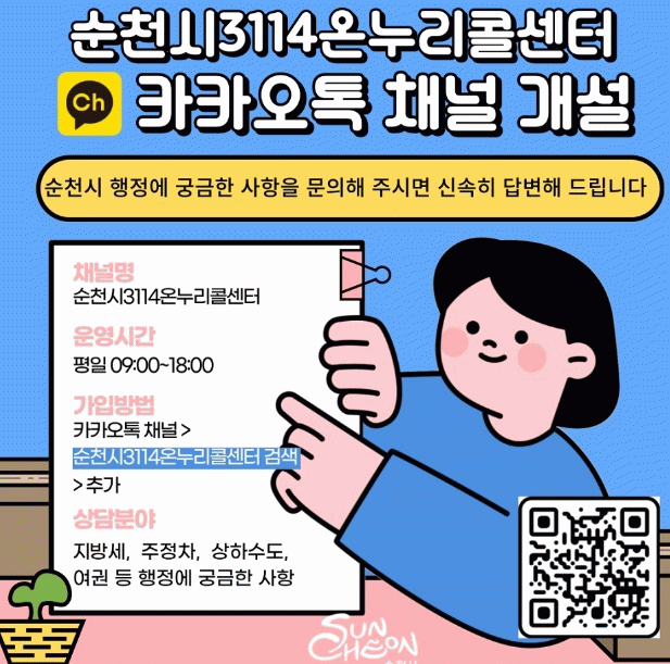 이용 방법은 카카오톡에서 ‘순천시3114온누리콜센터’를 검색하고 친구 추가만 하면, 언제 어디서나 손쉽게 민원상담 서비스를 이용할 수 있다.