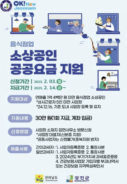 신청 자격은 2024년 12월16일(민생대책 발표일) 이전 도내 사업장을 등록 또는 유지 ②소상공인(상시근로자 5인 미만)이 대상이다. 2024년 국세청 부가가치세 신고 매출액 1억 400만 원 미만, 사업자등록증의 업태가 ‘음식점업’, 폐업 상태가 아닌 개인·법인사업자 등으로 이 조건을 모두 충족해야 한다. 신청 방법은 사업장 소재지의 읍‧면사무소로 방문하면 신청할 수 있다.
