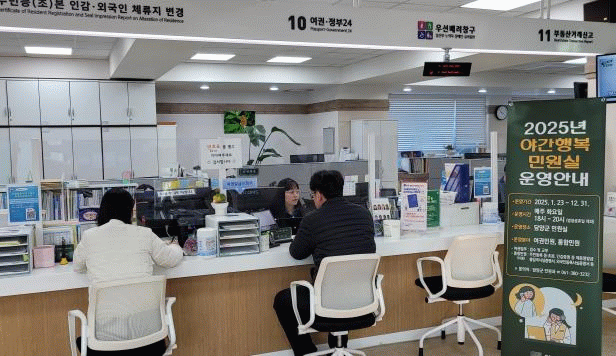 2024년에 처음 운영을 시작한 야간 민원실은 △여권 △주민등록등·초본 △인감증명서 △출입국사실증명서 등의 민원이 총 164건 중 90%(148건)를 차지했으며, 특히 여권 발급은 최근 급증한 해외여행에 따라 수요가 계속 늘어나고 있어 큰 인기를 끌었다.