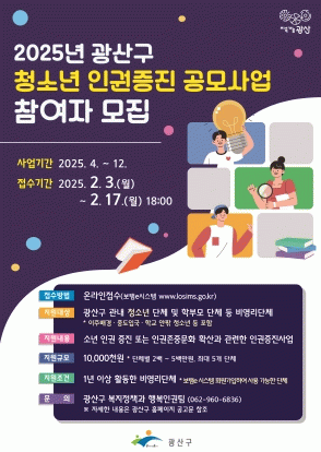 광산구가 올해 처음 시행하는 이 사업은 학교 폭력, 디지털 인권침해 등 다양한 청소년 인권 문제 해결을 돕고, 청소년 인권 보장 기반을 조성하는 것이 목적이다.