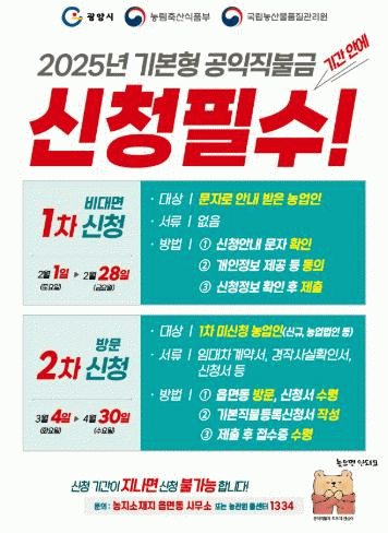 2월 1일부터 2월 28일까지는 비대면 신청 기간으로, 비대면 신청 대상은 지난해 공익직불금 지급정보와 올해 농업경영체 등록정보에 변동이 없는 농업인이 대상이다.