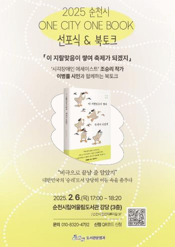 시 관계자는 “이번 선포식을 시작으로 동아리 릴레이 독서, 독서토론, 저자 초청 강연 등 다양한 2025 ONE CITY ONE BOOK 프로그램이 진행될 예정이다”며 “올 한 해 동안 순천시민이 함께 읽고 생각을 나누는 문화도시 순천이 되기를 희망한다”고 말했다.