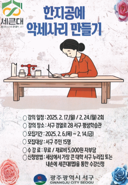 이번 프로그램은 ‘한지공예 악세사리 만들기’로 지역 내 한지공예 전문가가 일타강사로 나서며, 서구평생학습관에서 2월 17일과 24일 2회 과정으로 진행된다.