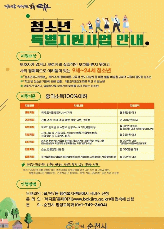 신청 방법은 주소지 관할 읍·면·동 행정복지센터 방문 또는 ‘복지로’ 누리집에서 신청할 수 있으며, 기타 문의사항은 순천시 평생교육과를 통해 안내받을 수 있다.