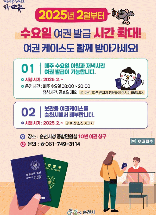 시 관계자는 “이번 운영 시간 확대를 통해 시민들이 보다 편리하게 여권 업무를 이용할 수 있길 기대한다”며, “앞으로도 맞춤형 민원행정서비스를 지속적으로 확대해 나가겠다”고 밝혔다.