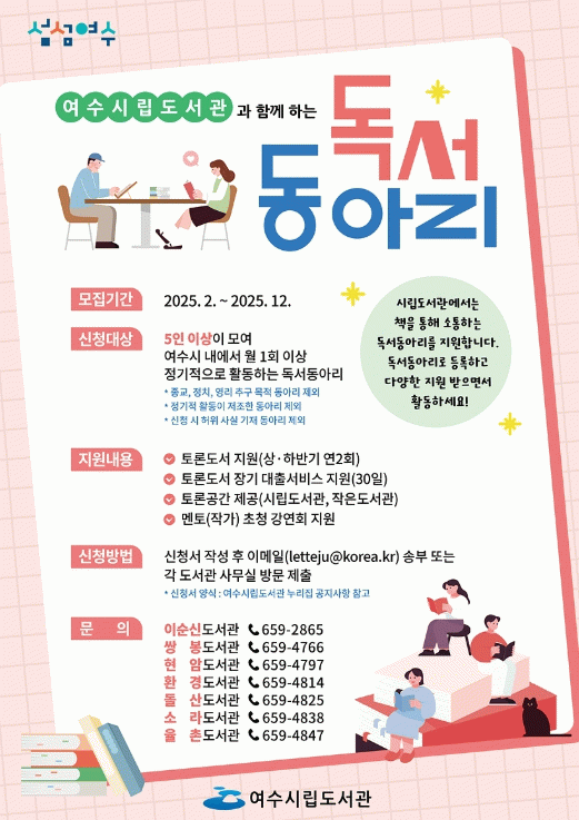 등록을 희망하는 시민은 여수시립도서관 누리집 공지사항에서 등록신청서를 내려받아 작성한 후 전자우편 또는 7개 도서관에 제출하면 된다.