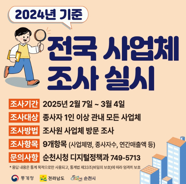 이번 조사는 우리나라 사업체의 지역별 분포와 고용 구조를 파악하여 정책 수립 및 기업 경영 계획, 학술연구 등의 기초자료로 활용하기 위해 꼭 필요한 전수통계조사로 매년 통계청이 주관하고 순천시가 실시한다.