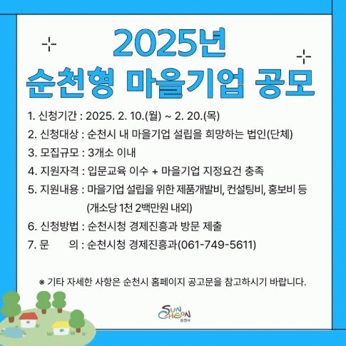 교육 및 공모 신청은 시 누리집 ‘고시/공고 게시판’의 ‘2025년 순천형 마을기업 입문교육 신청 공고’, ‘2025년 순천형 마을기업 모집 공고’를 참조하면 된다.