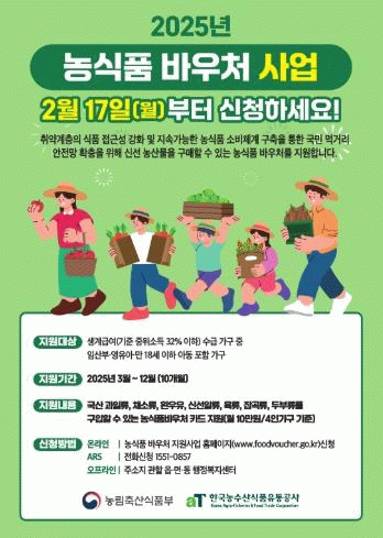 오는 2월 17일부터 신청 접수를 하며 읍·면·동 행정복지센터를 방문하거나 농식품바우처 누리집 온라인 신청, 대표번호 ARS 서비스를 통해 다양한 경로로 신청할 수 있다.