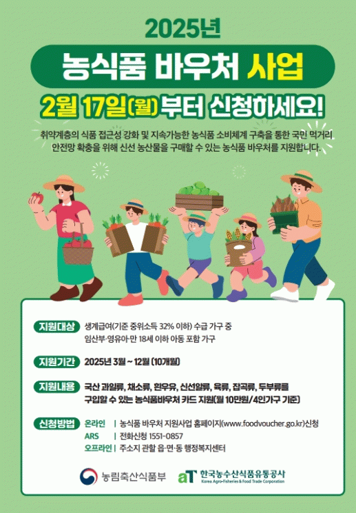 신청은 오는 17일부터 주민등록 주소지 관할 읍·면사무소(산업팀) 방문, 온라인(농식품 바우처 누리집), 농식품 바우처 고객지원센터를 통해 가능하며, 연중 신청할 수 있다.