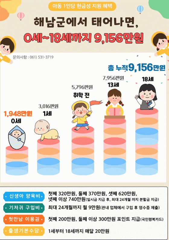 해남군 신생아 양육비는 총 금액으로 첫째아 320만원, 둘째아 370만원, 셋째아 620만원, 넷째아 이상 740만원이 지급된다. 해남군은 소득수준과 관계없이 매월 9만원씩, 최대 24개월동안 216만원의 기저귀 구입비도 지원한다.