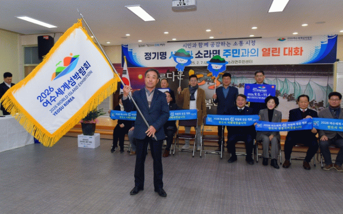 조직위에 따르면 지난 7일 소라면 주민센터에서 정기명 여수시장이 정안조 소라면 이장협의회장에게 섬박람회기를 전달하고, 소라면 지역주민들과 함께 성공개최를 다짐했다.
