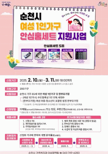 신청 자격은 순천시에 주민등록을 둔 65세미만 ▲여성 1인가구 ▲한부모가정이다. 여성범죄피해자, 장애인, 기초생활수급자, 차상위계층 등 우선순위 조건에 맞춰 선정하여 지원할 계획이다.