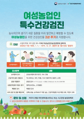 여성농업인 특수건강검진은 일반건강검진과 달리, 여성농업인이 취약한 질환을 조기에 발견하고 예방할 수 있도록 마련됐다.