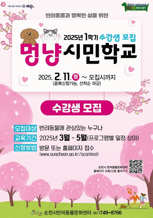 강좌 신청은 오는 11일부터 ‘순천시 반려동물문화센터 누리집과 반려동물문화센터 방문을 통해 선착순으로 받는다.