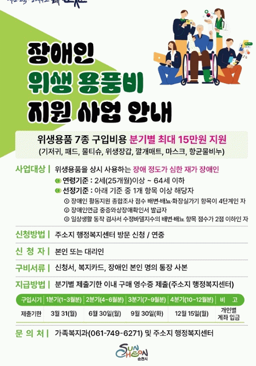 시 관계자는 “순천시는 2023년부터 다양한 유형의 장애인복지 증진을 위해 전국에서 처음으로 장애유형과 무관하게 장애인 위생용품 구입비를 지원하고 있다”며, “앞으로도 장애인과 그 가족의 경제적 부담 경감과 건강한 생활에 보탬이 될 수 있도록 다양한 장애인복지 정책을 추진해 나가겠다”고 말했다.