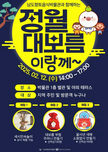 남도향토음식박물관의 2025년 첫 세시풍속 행사인 이번 프로그램은 누구나 참여 가능하며, 대보름 부럼 주머니와 소원엽서 만들기는 선착순으로 현장 접수로 진행된다.